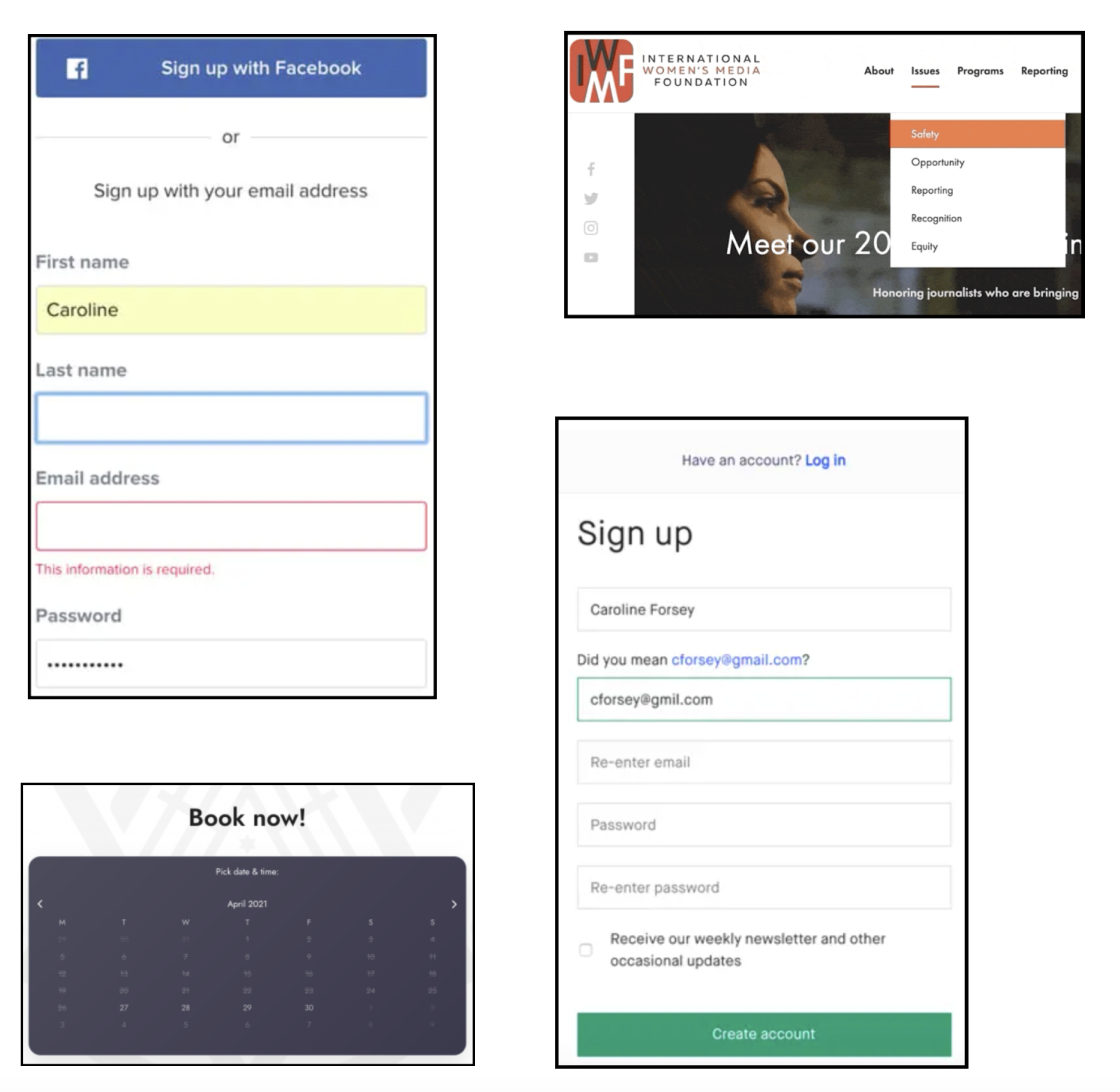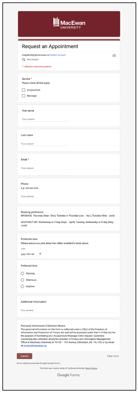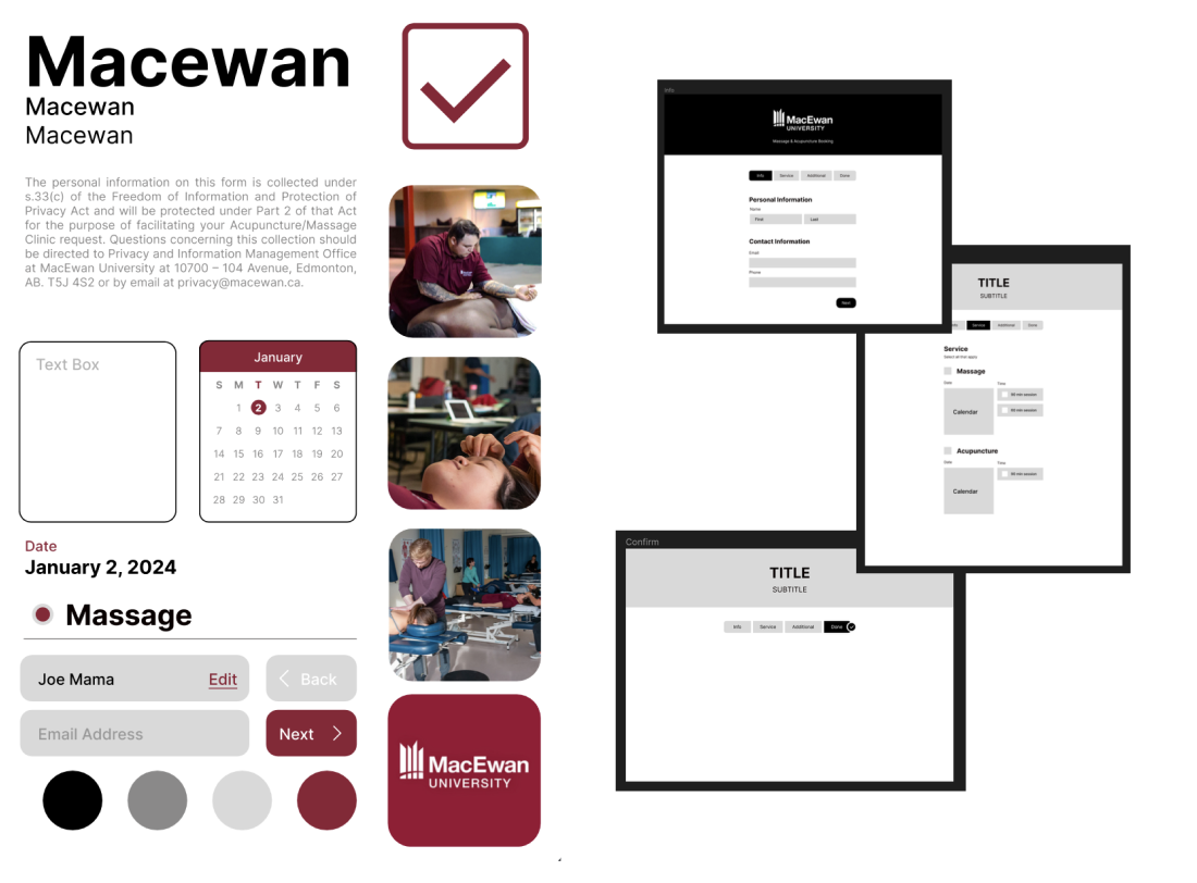 I explored examples of form column layout, dropdowns, error corrections, button design, and validations; which are all very important elements to consider in a good form. This method helped me come up with design solutions for the issues that the user may encounter when filling out the form. Since the form is specifically for making an appointment for the university’s massage clinic, creating an effective date and time chooser was really important.