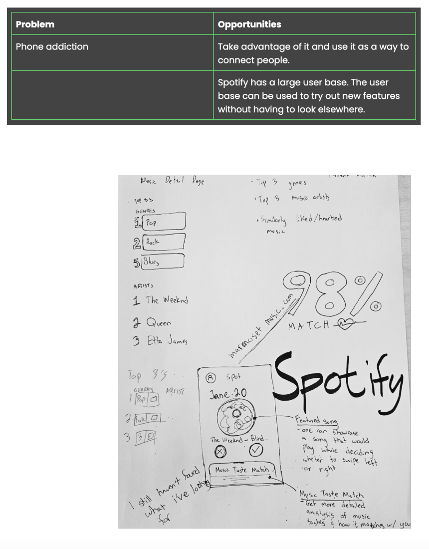 Although Spotify is already a good app by itself, we identified features we thought the app was missing. The problem was that the app did not really have a feature to connect people. In this case, we took the opportunity to create a matching system that matched users with similar music taste. To accommodate all users, we decided that it would be better to have the feature open to any purpose as opposed to it being exclusively for dating.